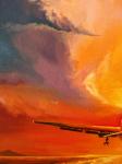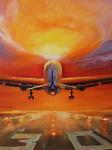 This dynamic painting captures the moment of an airplane taking off from runway 30, soaring towards a dazzling sunset. The sky is painted in vibrant shades of orange, yellow, and purple, with dramatic clouds that evoke a sense of freedom, adventure, and hope. Perfect for aviation enthusiasts, travelers, or anyone seeking inspiring art for their interior.
