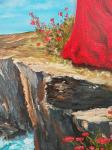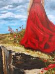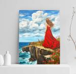 This inspiring painting depicts a girl in a flowing red dress standing on the edge of a cliff overlooking a turbulent ocean. The wind is blowing her hair, and vibrant red poppies are blooming around her under a dramatic sky with clouds. It symbolizes freedom, change, and the beauty of nature. Perfect for interior decoration, it will add atmosphere and emotion to your home or office.
