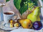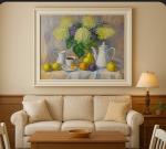 Still Life with Coffee and Hydrangeas" is an oil painting, hand-painted on canvas. In the center of the composition is refined white porcelain, a cup of aromatic coffee, juicy pears, apples and plums, as well as a lush bouquet of delicate hydrangeas. A gentle play of light and a warm palette create a feeling of coziness, tranquility and harmony.