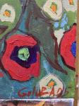 Original 40x60 cm oil painting on canvas. A bright countryside landscape with red poppies in the foreground and white village houses with barns and cars in the background. Expressive and decorative.
