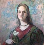 The portrait is based on an academic drawing in a lively impressionistic manner in one session. The lively energy of the brushstrokes and exquisite pastel tones in the background and clothes fill the work with lightness and vivacity.