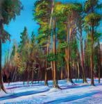 An atmospheric winter landscape. A fox goes hunting on a clear winter day. Rays of sun pierce through the snow-capped spruce branches.