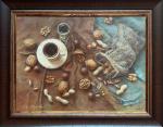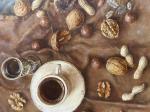 Black coffee with nut liqueur, scattered nuts — everything moves to the rhythm of jazz.