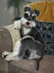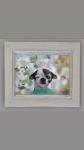 "Spring Dog" — a realistic pastel painting of a small dog wearing a knitted turquoise sweater. With ears pressed back and eyes closed, it enjoys a peaceful spring moment. On the left, a blooming apple branch adds freshness and warmth to the gentle scene.