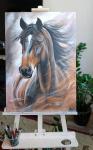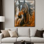 The interior painting, made with acrylic paints, depicts an elegant horse with its mane fluttering in the wind and its gaze fixed on a goal. The background is made in warm brown and soft white tones, which creates depth and contrast. This style reflects movement and energy, emphasizing speed and grace in a perfect symphony of nature. This is a wonderful gift for the new year. the year of the horse.