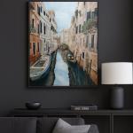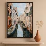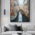 a painting depicting Venice, Italy, with canals and boats, buildings on both sides. the water is calm, the sky is blue, the sun is shining. The overall color tone is light brown, beige, green, light pink, white and black, made with acrylic paints. The details are clear, the lighting is soft, and the scene conveys a natural, romantic atmosphere. The painting will be a wonderful gift and will decorate your interior.