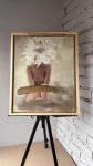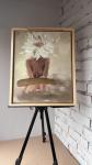 The painting is framed with a simple, light-coloured wooden frame and displayed on an easel. The overall style of the work leans towards surrealism with elements of abstraction — the combination of the human body and the floral motif evokes associations with fragility, beauty, and unity with nature. The composition appears harmonious due to the balance between the realism of the body and the óñëîâíîñòü ( óñëîâíîñòü can be translated as “conventionality” or “symbolic nature”) of the floral “head”.