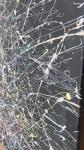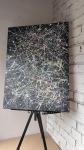 his abstract canvas, executed in the legendary «drip painting» technique (splattering paint), seems to invite you on a journey through a labyrinth of emotions and thoughts. The deep black background transforms into a cosmic space where vivid trajectories intertwine — white, yellow, pink, and blue lines, resembling the trails of meteors in the silent night sky.