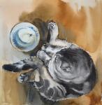 -village, cat, cat, sepia, sienna, gray, red, small watercolor, morning, spider, spider