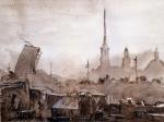 An ordinary cloudy day in St. Petersburg on the Neva embankment. The landscape is made in watercolors using a monochrome technique, the color is sepia.