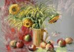 This is a morning filled with the soft green freshness of apples and the tenderness of graceful daisies. The white-green tone of the work evokes calmness and tranquility.