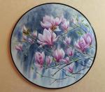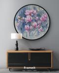 Delicate round watercolor work, perfect for an interior accent. The composition with branches and magnolia flowers is conveyed by transparent, multi-layered layers: soft pink-purple petals seem to glow against a background of cool blue and smoky gray tones, creating a feeling of early spring and light coolness. The round 70x70 cm format gives the painting integrity and decorative expressiveness — it attracts the eye and harmoniously fits into modern and classic interiors.