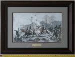This is one of the sketches in a series that the artist dedicated to the Patriotic War of 1812. This artwork vividly captures a historical battle scene, vividly portraying cavalry soldiers in mid-charge across a tumultuous battlefield. The dynamic movement of the horses, rendered with precision, highlights the intensity of the moment. The soldiers, clad in detailed uniforms, evoke a sense of period authenticity, their determined expressions underscoring the gravity of their mission. In the background, plumes of smoke rise, subtly indicating the chaos of war. Visible trees, stark against the sky, define the setting with a haunting sense of desolation. The use of muted colors enhances the somber mood, emphasizing the drama and urgency. This framed piece, with its refined border, draws the viewer in, making them almost feel the thunder of hooves and the tension in the air. The meticulous attention to detail and composition showcases the artists skill in bringing history to life.