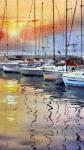 This original watercolor painting captures the serene beauty of Gandia’s harbor in Spain at sunset. Soft washes of warm orange, pink, and violet blend across the sky, reflecting gently on the still water below. Elegant sailboats rest quietly, their masts reaching into the glowing horizon. This artwork evokes calm, travel memories, and coastal charm, making it a perfect addition to any home seeking a peaceful Mediterranean atmosphere.