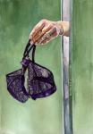 “In the Fitting Room” is a watercolor from the series “Traces of Presence,” capturing a quiet and intimate moment of feminine everyday life. A gentle gesture with a lace bra creates a feeling of privacy and subtle intrigue.