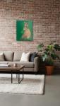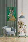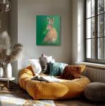 This painting captures a European hare, presented in a moment of serene contemplation against a backdrop of lush emerald greenery. The vertical composition of the canvas emphasizes the stature and natural alertness of the animal, whose gaze is fixed directly upon the viewer.