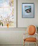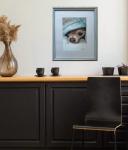 A tender pastel portrait capturing a small dog wrapped in soft blankets after a bath. Only the muzzle and one wide, expressive eye peek out from under a textured blue towel, creating an intimate and heart-warming moment. The detailed rendering of the wet fur, gentle light, and cozy fabrics brings a sense of warmth, care, and vulnerability. This artwork blends realism with emotional storytelling, making it a charming piece for collectors who appreciate animal portraits filled with character