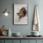 A refined pastel portrait of a lion captured in a calm, contemplative profile. The soft, realistic rendering of the mane contrasts with delicate blue ornamental elements, creating a dreamlike atmosphere and a sense of inner nobility. The work combines classical animal portraiture with subtle symbolism, evoking strength, dignity, and quiet wisdom rather than aggression.