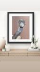 This expressive dry pastel artwork presents a frontal portrait of an ostrich, creating a strong sense of direct eye contact with the viewer. The bright reddish eyes and playful crest give the bird a distinctive personality, while the warm brownish-pink background enhances the softness and decorative appeal of the composition. The piece will attract collectors of contemporary animal art and those seeking character-driven works that bring warmth, humor, and individuality into interior spaces.
