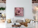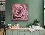 «Mystery of the Rose» is a feminine and celebratory artwork designed to become the centerpiece of an interior. A large rose blossoms in delicate shades of pink and dusty peach, gently highlighted by touches of gold leaf. Its petals seem alive, breathing with warmth and softness.