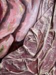 The work took more than three months to complete. It began with a small color sketch, followed by a large canvas that demanded new solutions. The rose was painted in layers of oil, but in a large format it seemed to ask for an additional frame. This led to the idea of a plaster drapery.