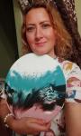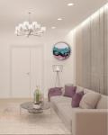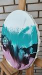 The image shows a round painting made in an abstract style. The main background of the painting is white, on which various color spots and lines are located, creating a dynamic and chaotic pattern. The color palette includes shades of blue, turquoise, black, pink and dark purple. These colors blend seamlessly into each other, creating a sense of movement and depth. In some places, darker and lighter areas are visible, which adds volume and texture to the picture. Abstract shapes and lines can evoke various associations in the viewer, from natural phenomena to space objects. This technique allows everyone to see something different in the painting, which makes it interesting and multifaceted.