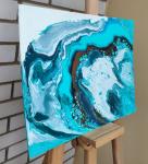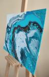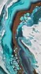 This captivating abstract painting, executed in the fluid art technique, immerses the viewer in a mesmerising dance of colours and textures. The canvas is dominated by a harmonious blend of turquoise, teal, white, and deep brown hues, evoking the imagery of ocean waves meeting a rocky shore.