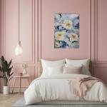 The shades evoke a feeling of coolness, morning air, or a touch of melancholy, but soft pastel pinks and yellows add warmth and hope. The thick, impasto brushstrokes make the composition lively and dynamic, as if a breeze stirs the petals and refreshes the mind.