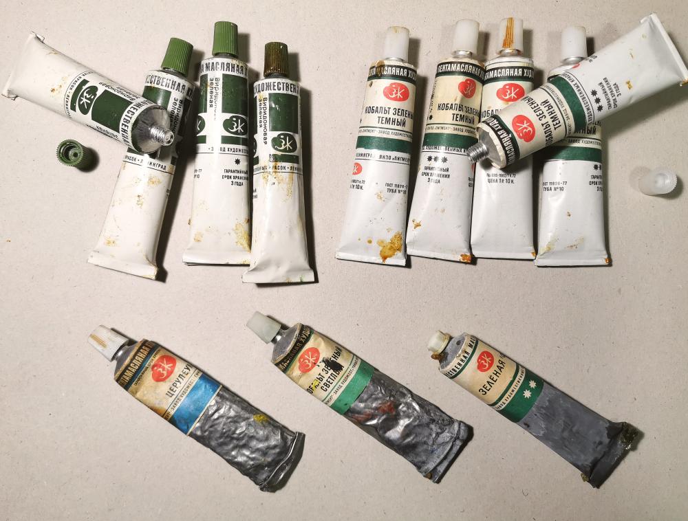 Церулеум - б/у, на 1/3 затвердел. Кобальт зелёный светлый - б/у, мягкий, Зелёная ФЦ - новая, мягкая - по 100 руб. 1 шт. Всё, что на фото.