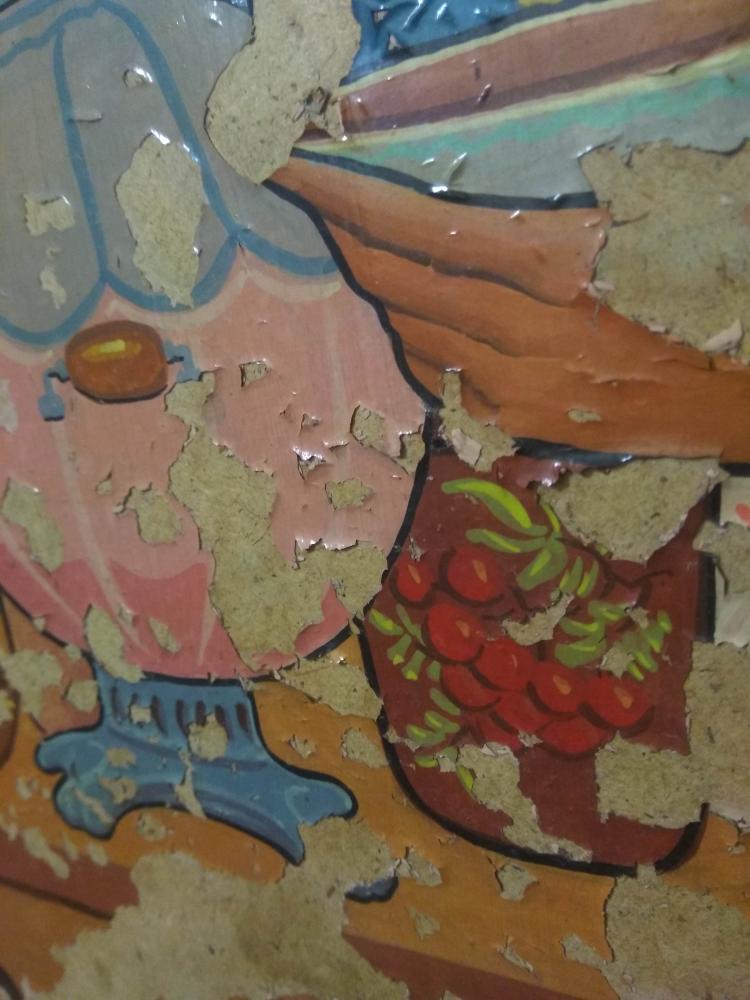 Теоретически после реставрации лицевого слоя может спасти нанесение грунта по торцам и на задник оргалита. Тогда перепады температуры и влажности будут не страшны и не будет нового шелушения.