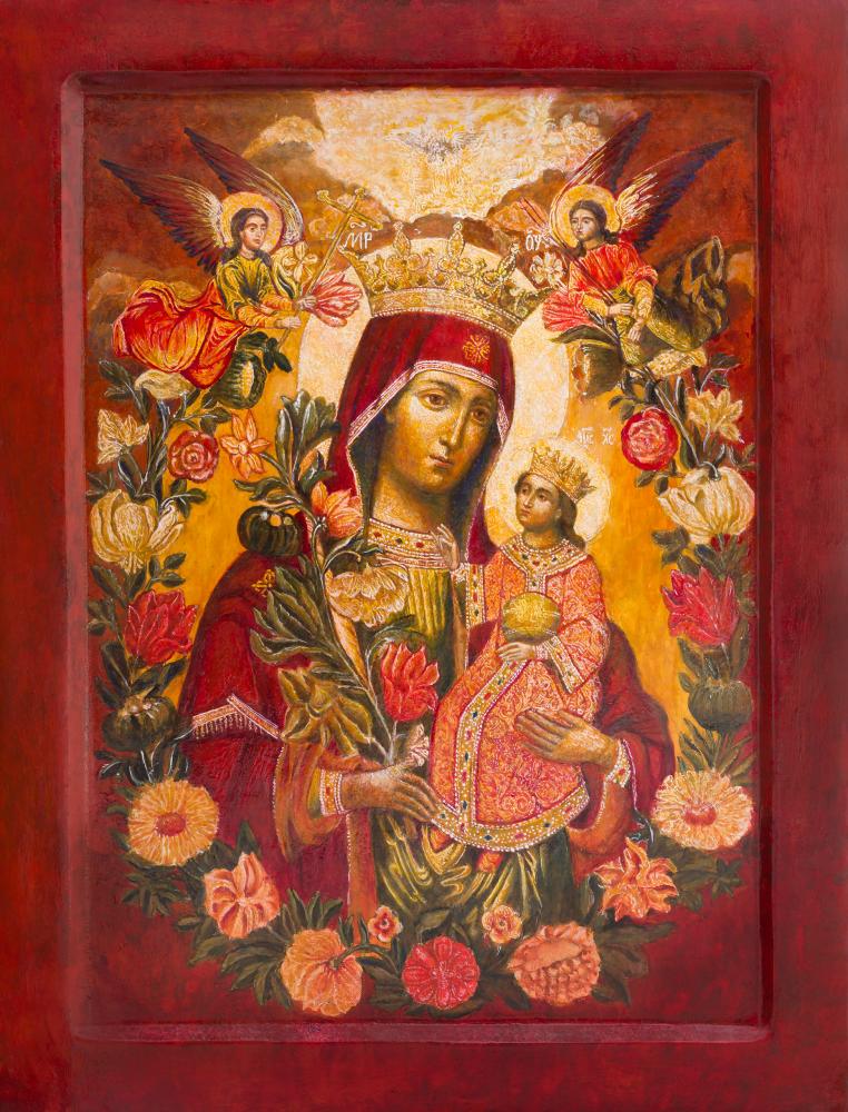 Закончил икону "Неувядаемый цвет". Дерево, ткань, цветной грунт, масло. Размеры: 57х43,5 см.