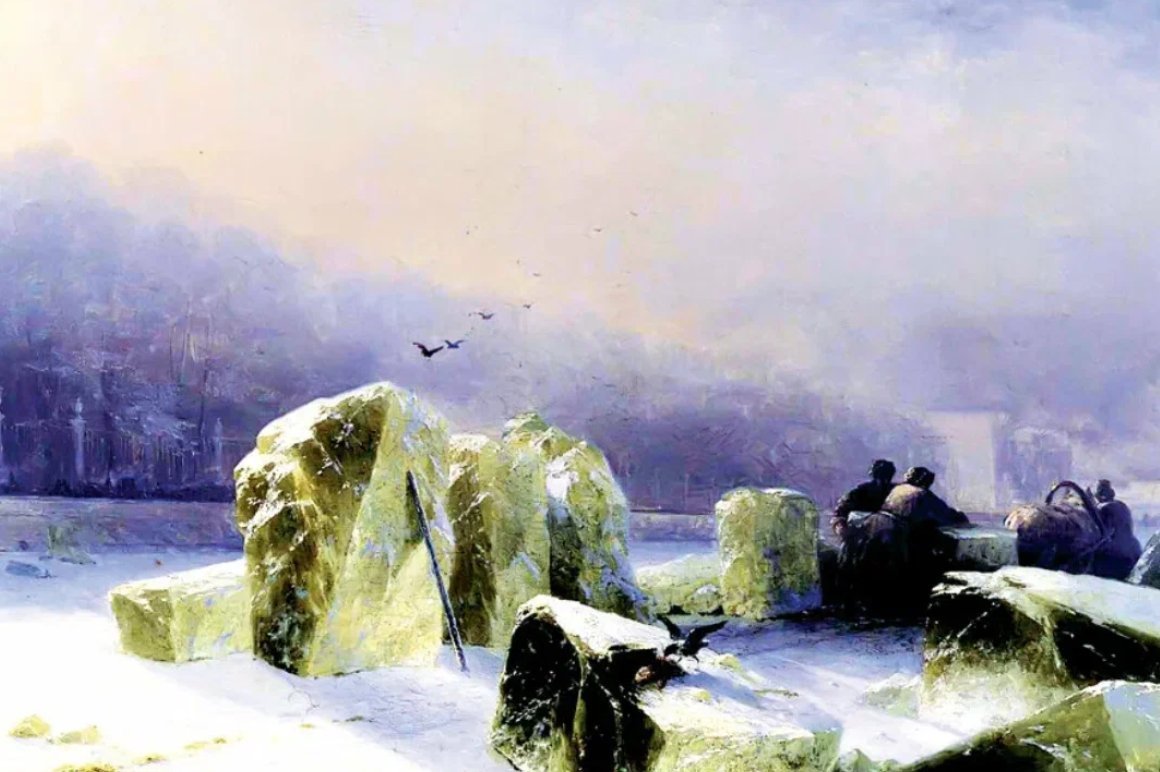 В левой глыбе льда вмёрзший утопленник. Видите? И по описанию Чехова - плешивый Узелков. Вернувшись в Петербург и прогуливаясь по набережной Невы, Узелков переживал очередной сон с умершей женой в виде девочки. Проклятый простатит вынудил его пустить струю в своё отражение в величаво текущих водах. Отражение разрушилось и пошло кругами... Это был момент истинного катарсиса, толкнувшего его к самоубийству. Он шагнул в холодные осенние воды. Так свершился суд высшей справедливости. ...