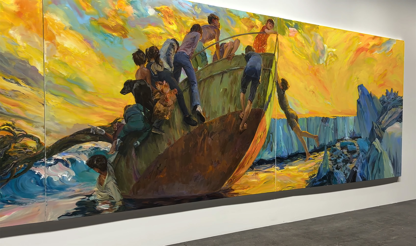 В этой работе, созданной в 2021 году, Ю Хун изображает группу молодых людей, пытающихся удержать лодку на плаву на фоне великолепного ледника и бушующих волн. Их отчаянная борьба за выживание резко контрастирует с беззаботными животными, упивающимися красотой ландшафта. Ввиду меняющегося климата и сложной возможности выживания человека произведение искусства призывает зрителей задуматься о том, что все живые существа, включая людей, являются частью одной и той же большой экосистемы.