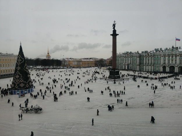 Столпотворение - в Зимний не попасть, не отстояв 2-3 часа на морозе(-7). Запускают раз в час . Потом все час стоят, дожидаясь очередного запуска. Рамки и гардеробы не справляются. А в новый филиал, напротив через площадь, в "Главный штаб", где вторая половина 19 века и 20 век, все импрессионисты авангард и до наших дней, очередь10-15 минут. Вот из окна Главного штаба и снял панораму Дворцовой пл. и очередь в Зимний дворец (слева от Александровской колонны), а там ещё двор, где очередь греческими меандрами :