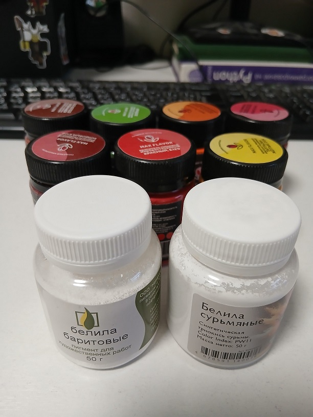 На фото видно - 2 баночки белил и 7 баночек пищевых ЖИРОРАСТВОРИМЫХ пигментов. Мне они не нужны - баритовые мне не подошли, суриковые оказались токсичные (узнал уже когда они приехали ко мне). Белила даже не открывались, то есть новые. Цвета заказал по ошибке - жирорастворимые, долго не мог понять почему они в воде плохо размешиваются :)) В общем может кому нужны? А нет, так выкину как обычно, хотя жена советует отнести на меняльник . В общем приезжайте - забирайте.
