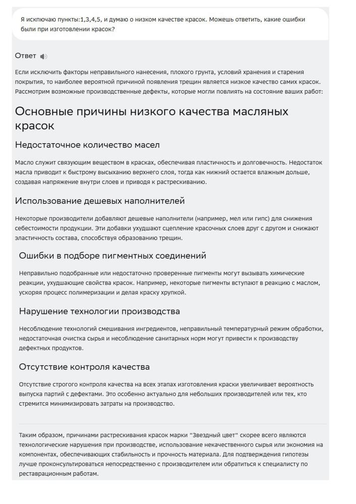 Всё таки ЗЦ - это великолепная идея, замечательные цвета и такая беда в исполнении! Пересматривала свои картины, выполненные ЗЦ год-два назад. Некоторые картины получились хорошо и краски звонкие, лёгкие, яркие, ну а на некоторых полный капец. Сидела искала причины: почему потрескались краски, спросила ИИ, и он мне выдал:)