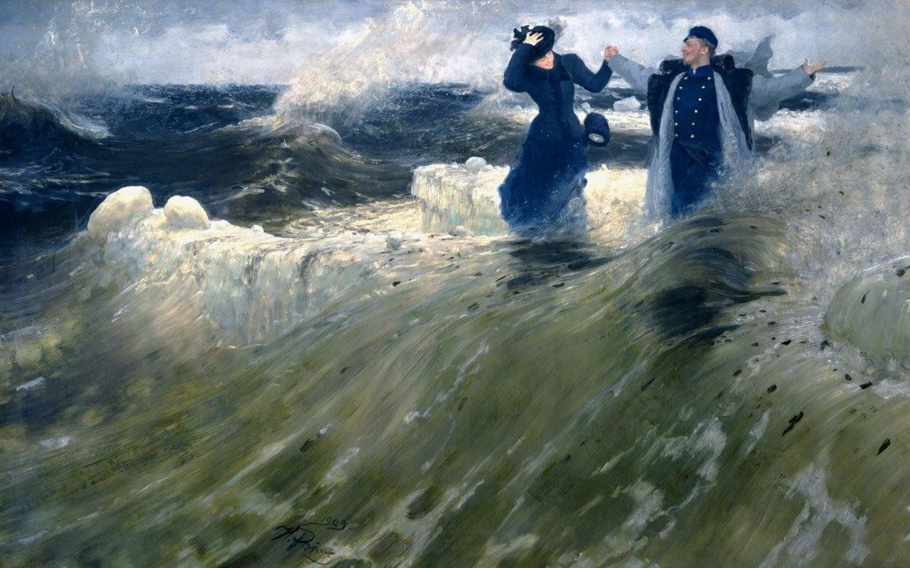 Да... уж... Тут на ногах бы устоять! :) Их немножко напрочапить бы, ведь впору не за шляпу хвататься, а за кавалера! Ноги ж со дна такой струёй отрывает, а они стоят, как вкопанные. Ну, мужик, ещё понятно, габариты имеет... А мадам? Тут не "хи-хи", тут визг поросячий надобен! Но не китч. Цвета хорошие, люди симпатичные, мусор и муть в потоке нравятся....