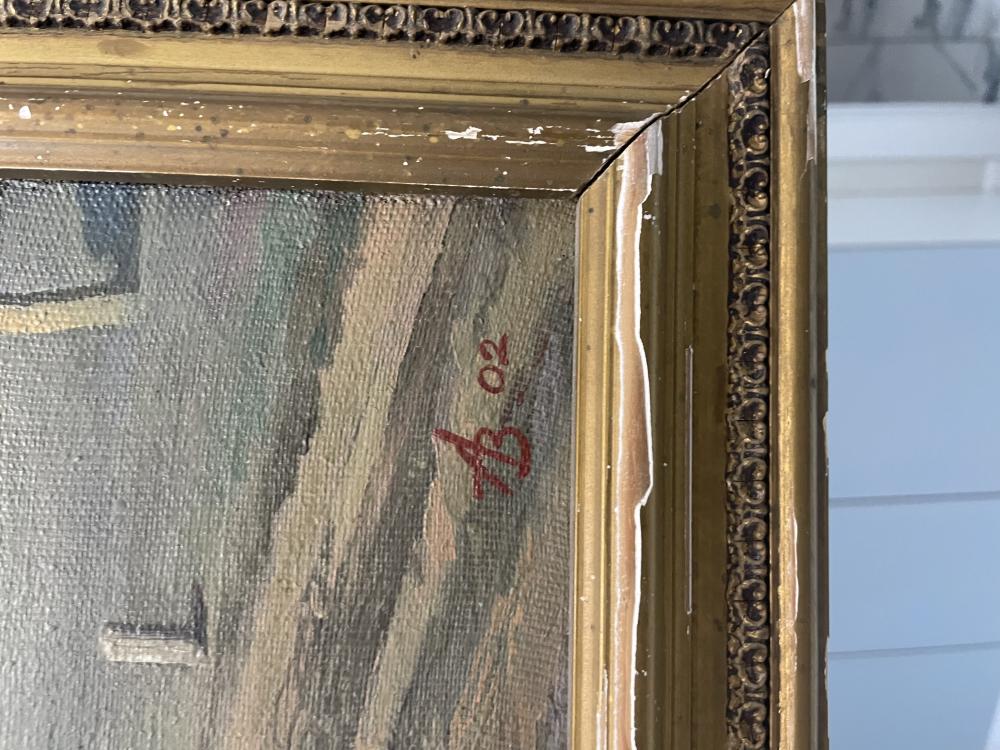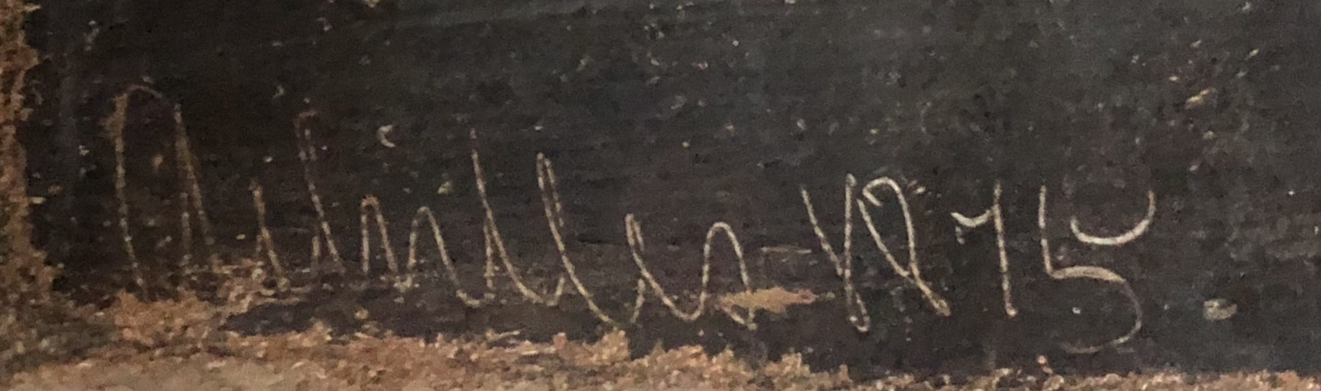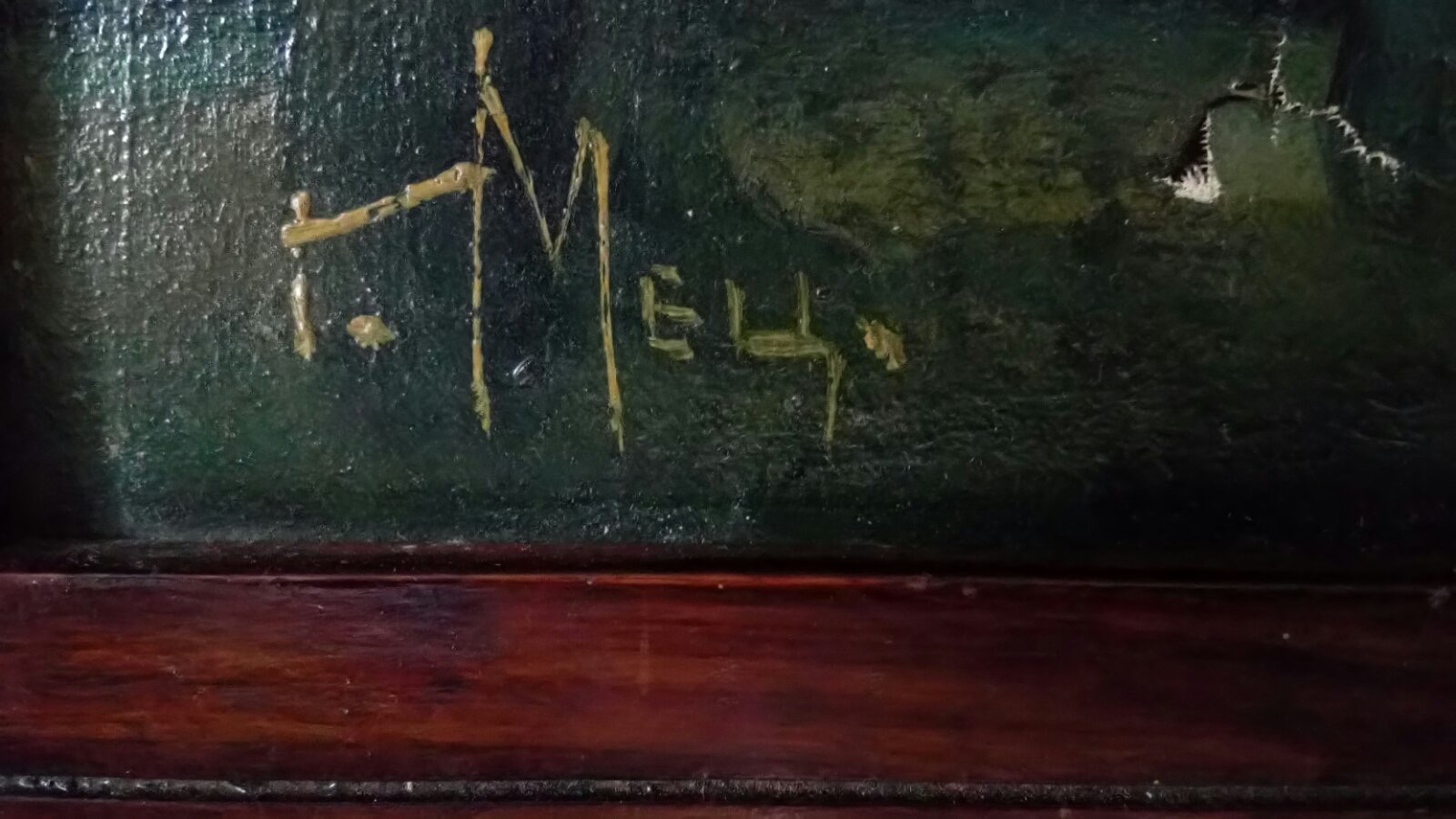 Добрый день! помогите идентифицировать автора. не могу разобрать подпись. Автор по-видимому зарубежный, год -1875. Картина в плохом состоянии, краска осыпается. Подпись слева в нижнем углу. На фото картины подпись засвечена, но прилагаю отдельно увеличенную. Спасибо.