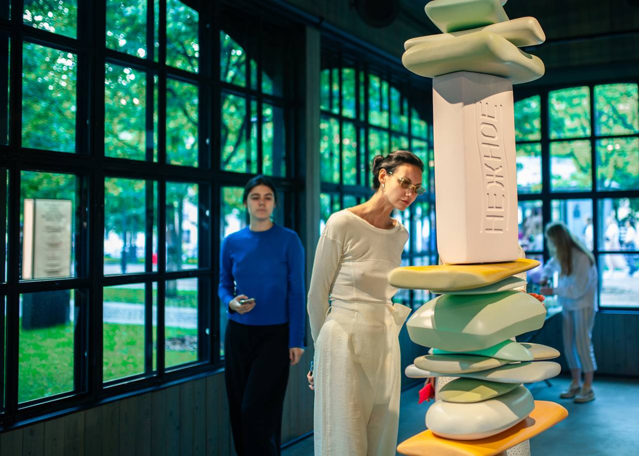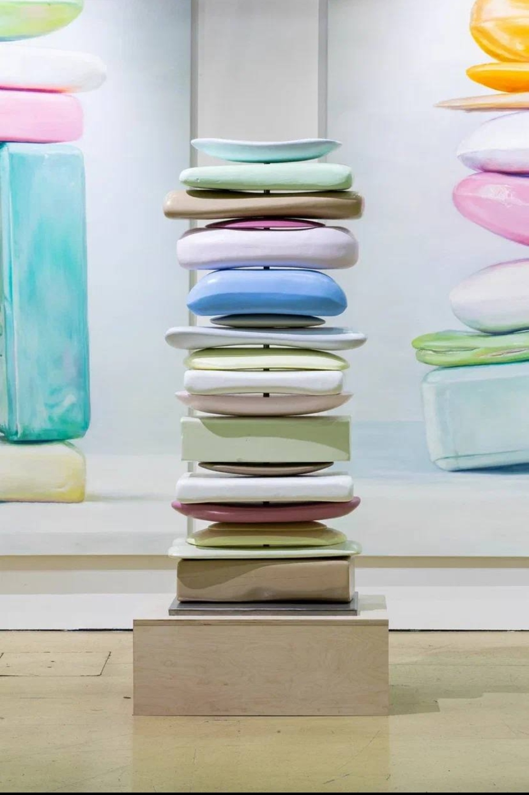 " На выставке вы увидите навечно застывшие в кратком моменте равновесия башни из гигантских кусков мыла и серию «Мыльные часы», где миниатюрные обмылки и их керамические близнецы неумолимо отдаляются, подчиняясь течению времени. "