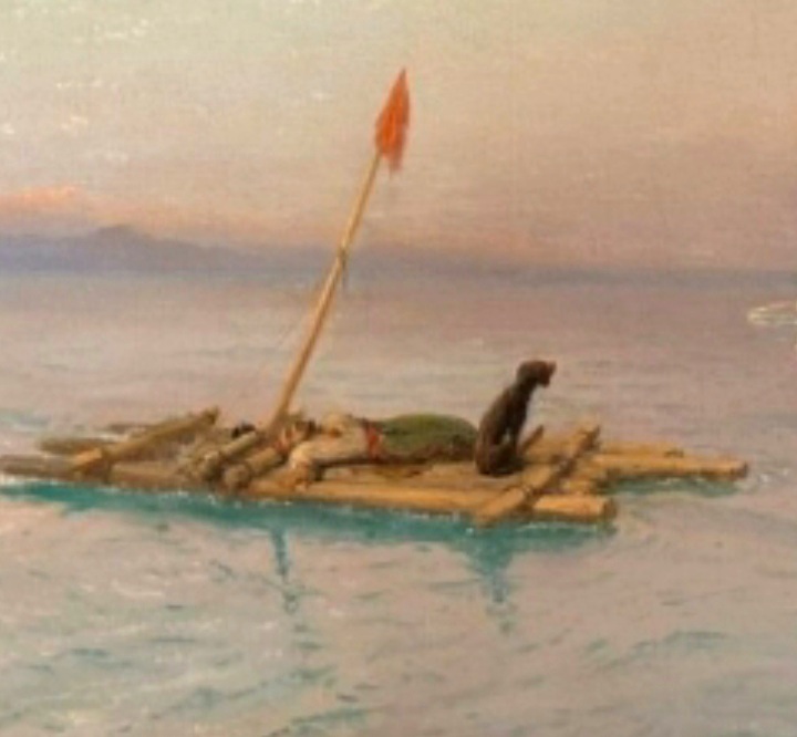 На плоту изображен турок, а не плотогон, которого спьяну вынесло в море. Одежда, красная тряпка-типа турецкий флаг.