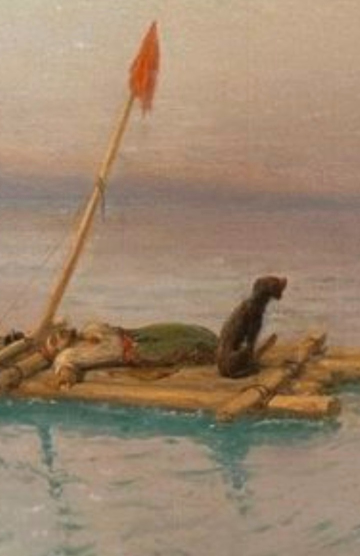 Что за дела произошли ? Плот, кусок мачты с тряпкой, собака... прямо загадка.