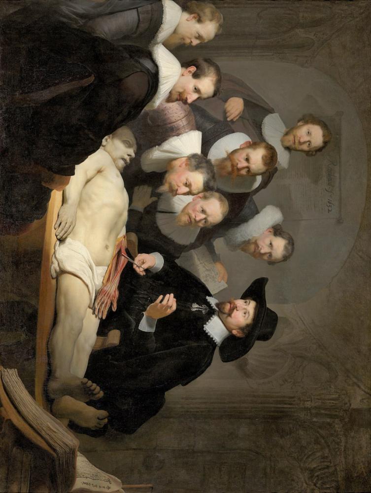 Столь изящное общество благородных господ художник не стал портить впечатлением излишнего натурализма неживого персонажа.Картина предназначалась для ратуши или другого общественного места ,посещаемого дамами в том числе ,и ничто в картине не отвлекает от нарядного общества гильдии врачей (лишние полметра ног на столе,например,явно не к чему)