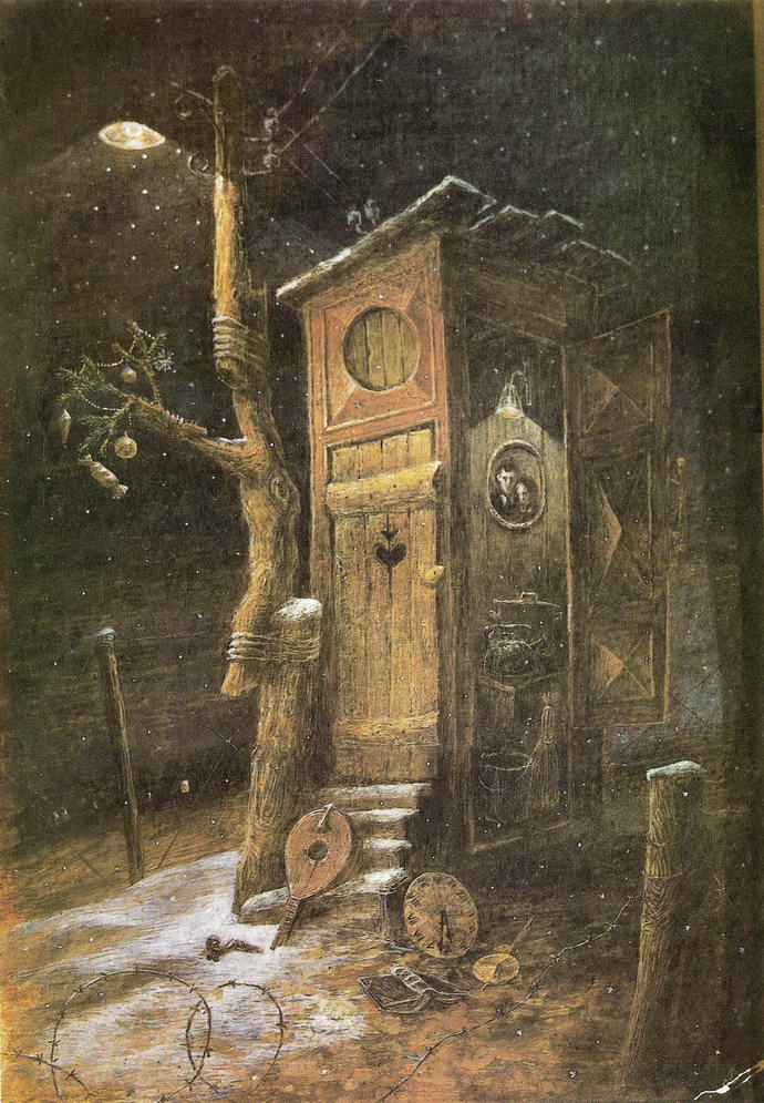 На старте (бумага и шариковая ручка) и сейчас (холст масло).