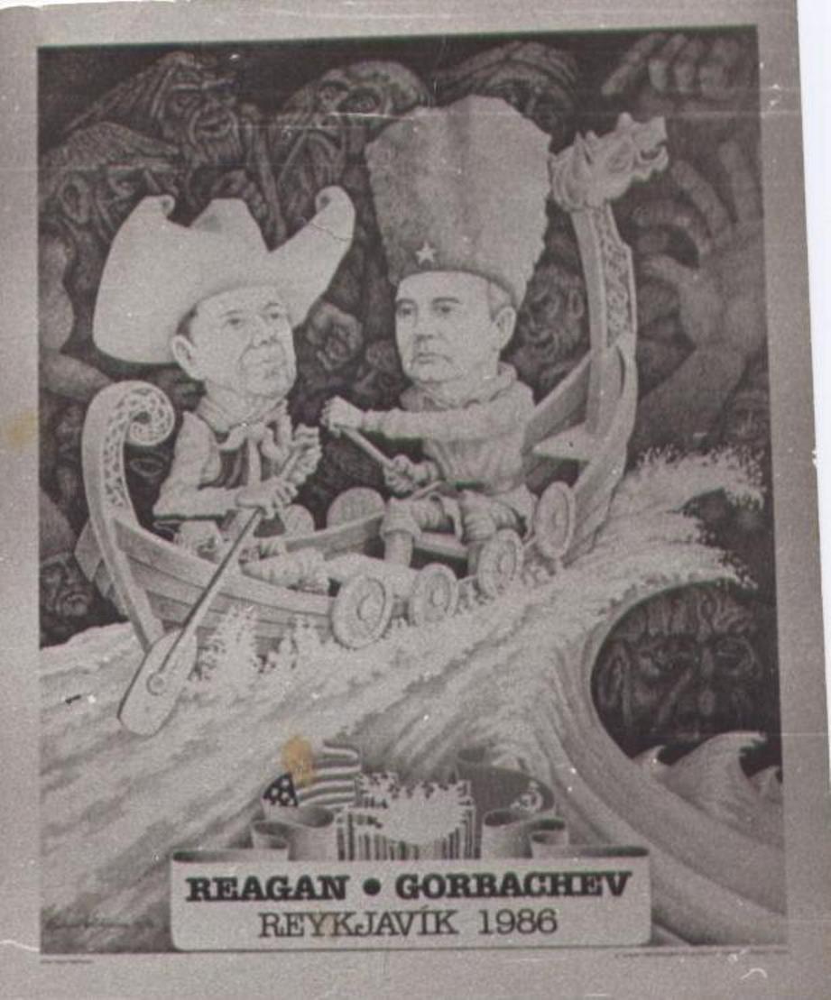 Несколько дней они пожили, ничего не ели, пришлось отпустить краснокнижных, тем более в порт идти. Одна встала на крыло, а другую ветром бульк в воду. Погибла. Ну а мы пошли в Рейкъявик. Там в те дни тоже пара встречалась Горбачев и Рейган. Вот плакат оттуда. Гребут в разные стороны. Ну а потом СССР тоже бульк. (вы же любите параллели, меридианы, Хармса и шизофазию)