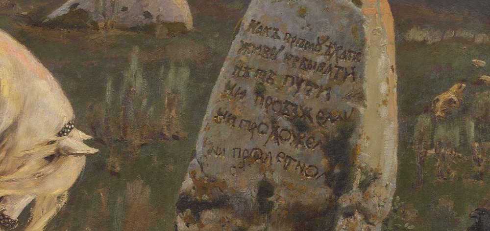 там начало хрестоматийной фразы "как пряму ехати..." продолжение В.М. Васнецов полуостёр, полузамазал чем-то (предположительно мхом)))