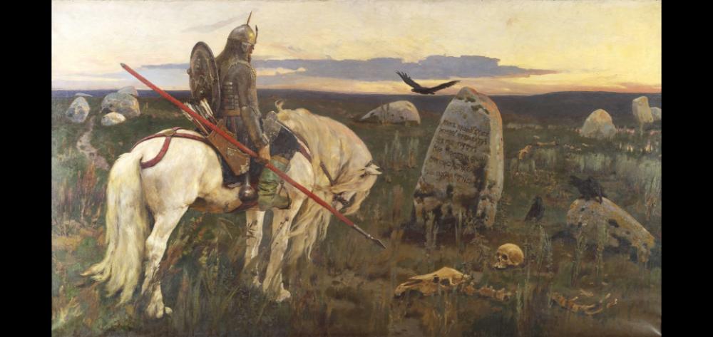 в хрестоматийном варианте былины предложено 3 варианта. начало (1 вариант пути), то, что вывел на камне Васнецов..