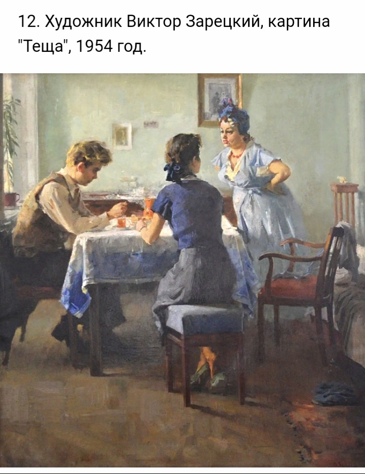 Если б не название картины, я бы подумала, что это "домохозяйка" студентов на съёмной квартире отчитывает. Видите, я прочитываю в соответствии со своим "опытом". А композиция в целом о натиске и обороне, думаю, что линии и цвета так себя и ведут. Диагональ и угол "тёщи" верхнее доминирующее положение, загнаны в нижний тёмный угол 2 другие фигурки.