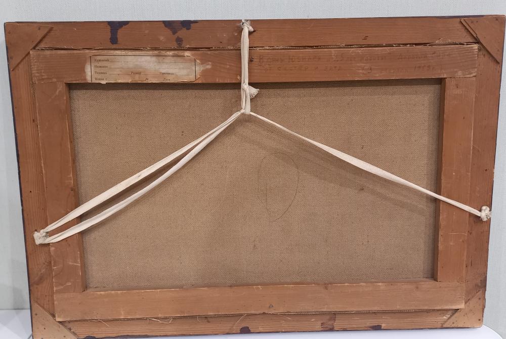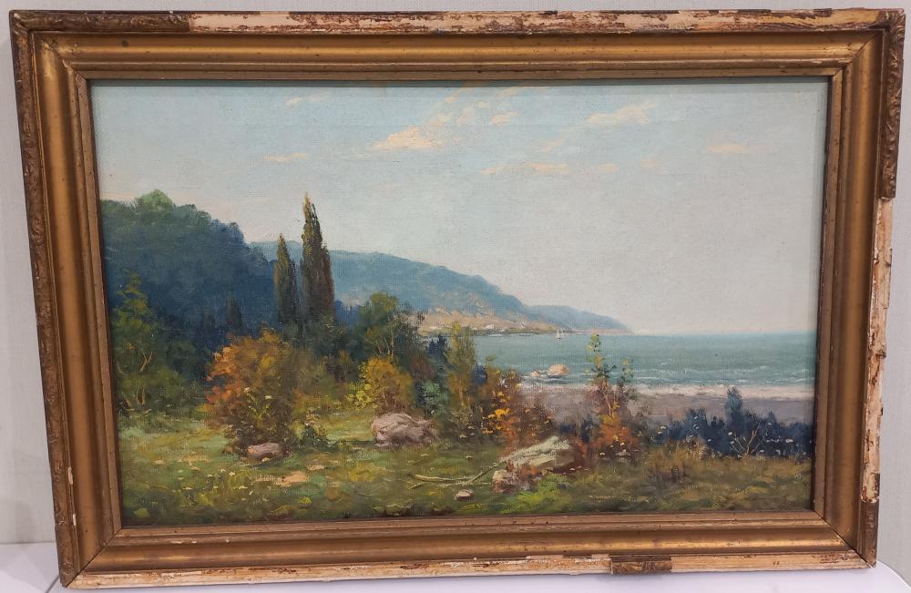 Здравствуйте! Прошу помощи в определении художника. Картину купили в 1959 году в Кирове, в комиссионом магазине. Уже в тот момент авторство художника теряется. Выскажите свои мнения по поводу возможного автора. По всей видимости на картине изображено побережье Крыма, а именно Ялта.