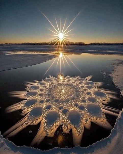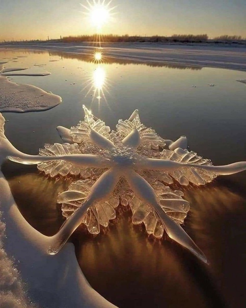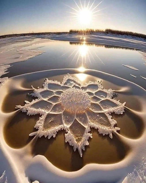 Но поданное под легендой: "Ледники Сонхуа образуются, когда поверхность реки замерзает, создавая слой льда, который часто покрывается слоем снега. Когда лёд начинает таять, на его поверхности образуются небольшие трещины, создавая цветочно-лепестковый узор. Эти трещины часто заполняются водой, создавая эффектный визуальный эффект, усиливающийся светом, пробивающимся сквозь лед." Источник этих фото остался анонимным. Но суть его подачи: фейк. Хотя и красивый; многие люди на него "купились".