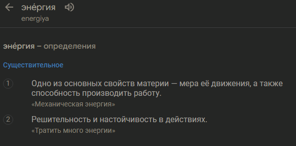 Термин «энергия» происходит от греческого слова ἐνέργεια. В виде основы ἔργον присутствует в таком интернационализме греческого происхождения как эргономика (приспособленность чего-либо к человеческой деятельности), в виде οργ / ουργ — в таких греческих словах, как оргия (блудодейство) или теургия (божественное действо).